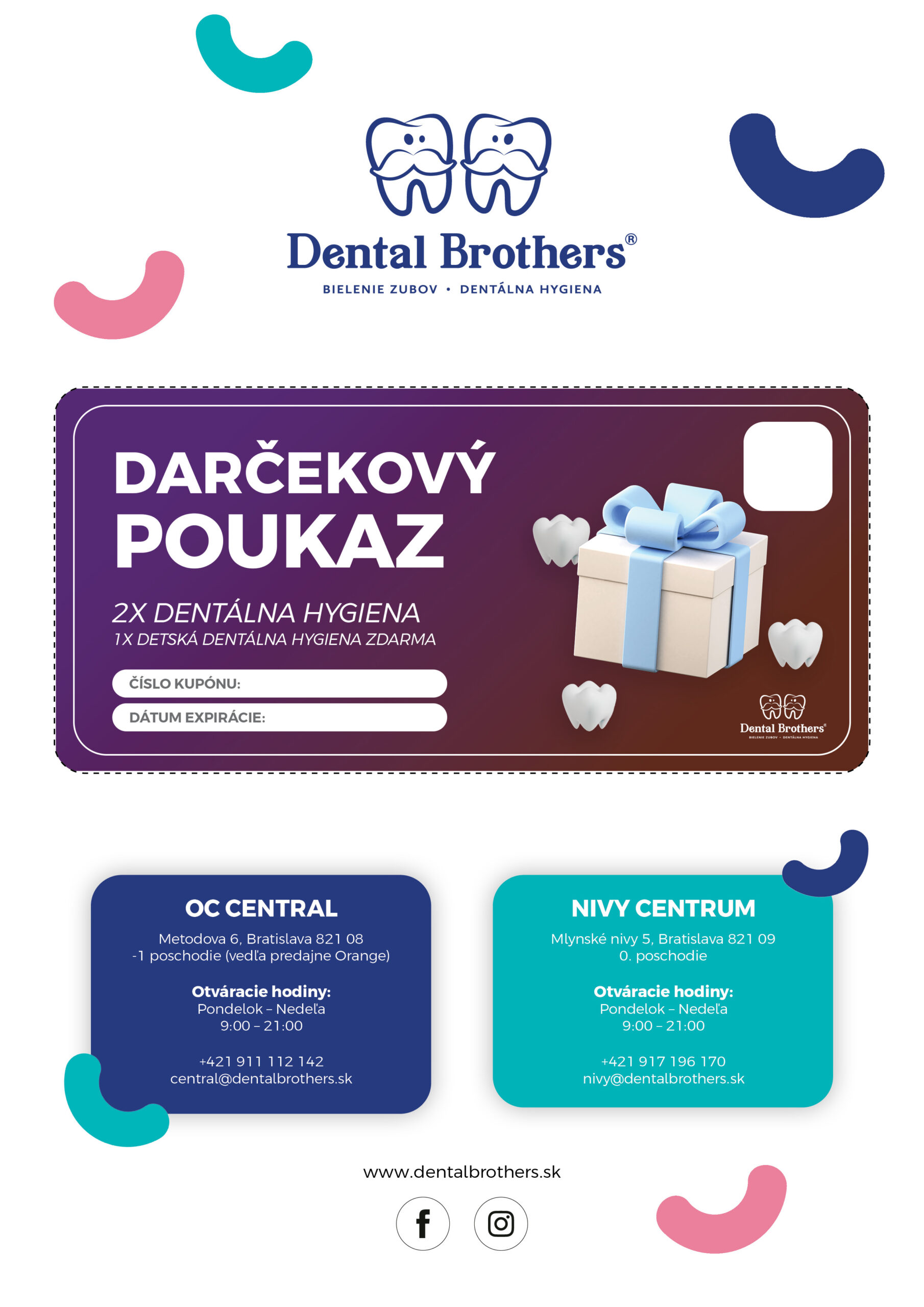 Darčekovú poukážku na 2× Dentálnu hygienu + Detskú dentálnu hygienu zdarma v hodnote 178 € môžete využiť na Dentálnu hygienu Premium pre 2 dospelých a zároveň získate 1× Dentálnu hygienu pre vaše dieťa zdarma.